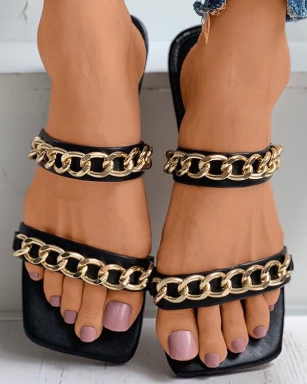 - Design: Elegante gouden kettingen verwerkt op de slippers.