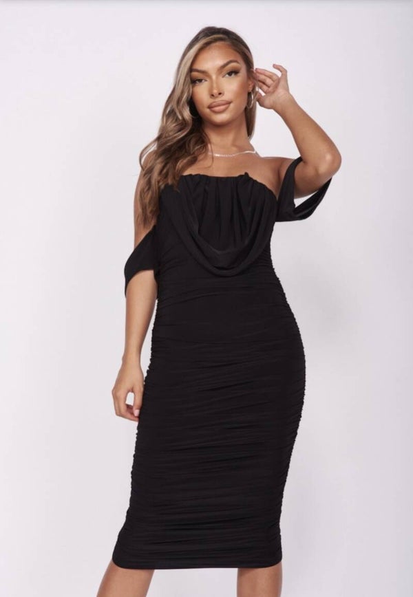 Als je op zoek bent naar de perfecte jurk voor dit seizoen, dan heb je geluk! Deze slinky midi jurk met ruches en off-shoulder detail is perfect voor een avondje uit. Combineer het met strappy heels en een clutch voor de ultieme stijl!