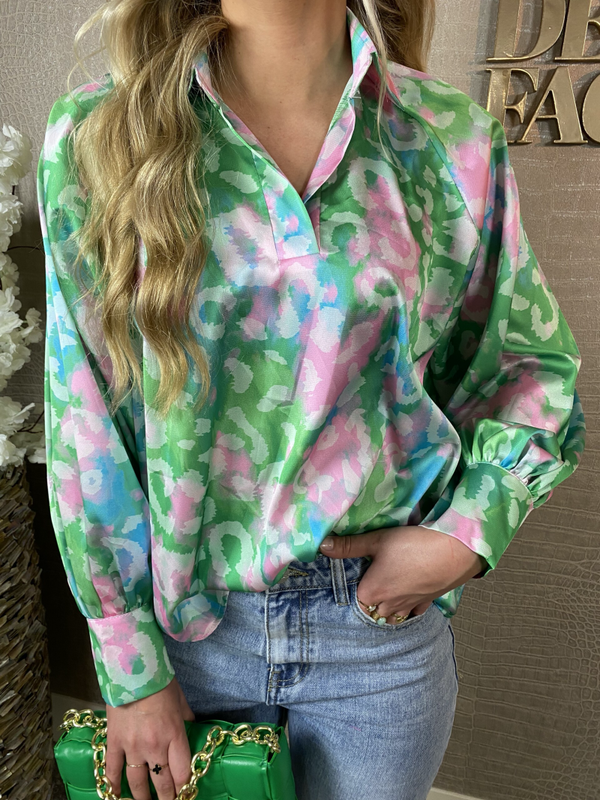 Chique Silky Blouse met Leuke Print – Deze elegante blouse in silky materiaal heeft een verfijnde print en wijdere mouwen met knoopjes voor een extra chique touch.