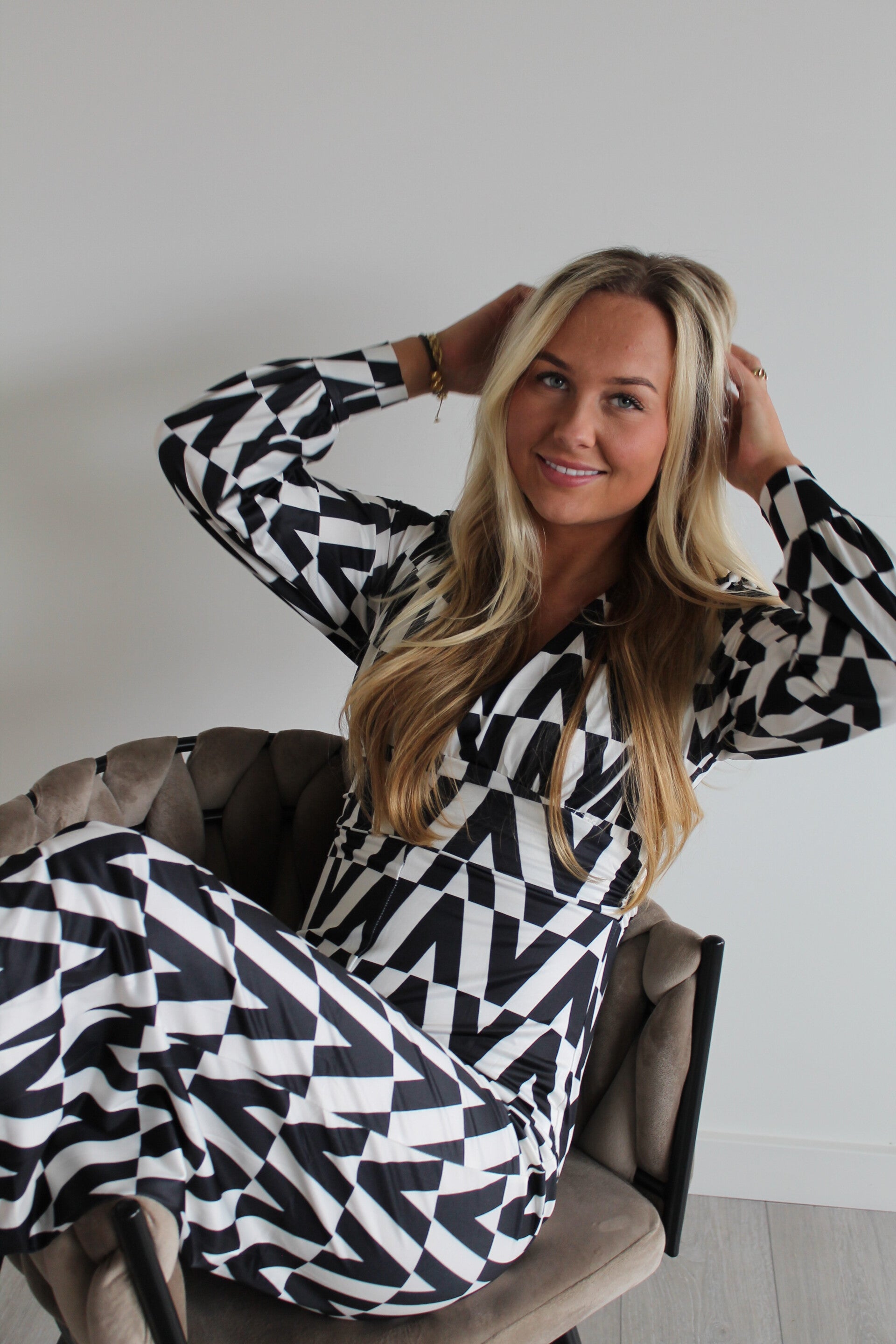 - Design: Opvallende zwarte print met subtiele pofmouwen.