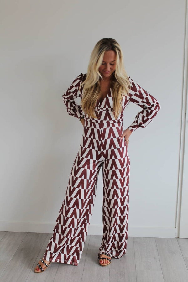 Super Mooie Jumpsuit met Opvallende bruine Print – Deze jumpsuit valt op door zijn prachtige bruine print en elastische stof die comfortabel meebeweegt. Het subtiele pof detail op de mouwen maakt het een extra chique item.